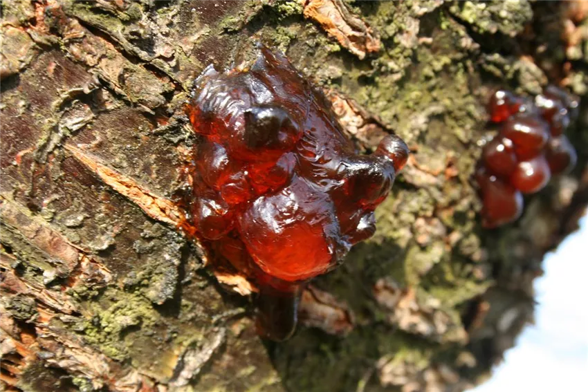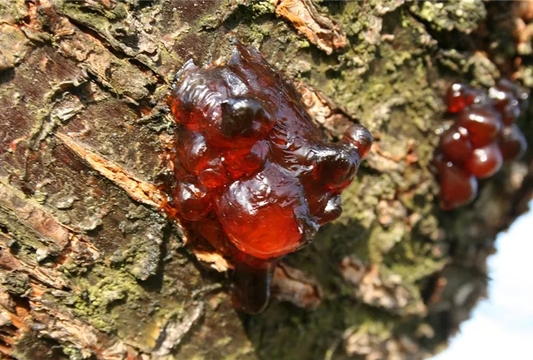 An Schnittwunden oder anderen Verletzungen der Rinde aber auch am scheinbar gesunden Holz bildet sich eine gummiartige, klebrige Masse, die farblos oder bräunlich gefärbt ist.