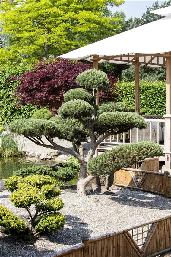 Gehölze, sowohl Sträucher, als auch Bäume, gehören in den japanischen Garten wie der Kaiser nach China. In der japanischen Kultur stehen Gehölze für das Sinnbild des Lebens und egal ob Nadel- oder Laubgehölz, ein Strauch oder Baum darf im japanischen Garten nicht fehlen. Idealerweise kombiniert man Nadel- und Laubgehölze gekonnt und schafft so verschiedene Bereiche im japanischen Garten. Besonders beliebt und passend zum japanischen Flair sind Formgehölze. Klassische Laubgehölze für den japanischen Garten sind Azalee, Fächerahorn, Rhododendron und die japanische Zierkirsche. Mindestens einer dieser Vertreter darf im japanischen Garten nicht fehlen. Aber auch Bambus, Kiefer oder Buche passen gut in das japanische Konzept und runden das Gesamtbild ab. Was auf gar keinen Fall fehlen darf, ist Moos. Was bei vielen Gartenbesitzern eine ungeliebte Begleiterscheinung im Herbst ist, ist für Fans des japanischen Gartens ein Sinnbild von Dauerhaftigkeit und eines langen Lebens. Durch seine besonderen Wuchseigenschaften und aufgrund der Tatsache, dass es besonders hartnäckig ist, wächst Moos auf nahezu jedem Untergrund, wie arm er auch sein mag. Bewusst gepflanztes Moos ist also ein absolutes Muss in jedem japanischen Garten.