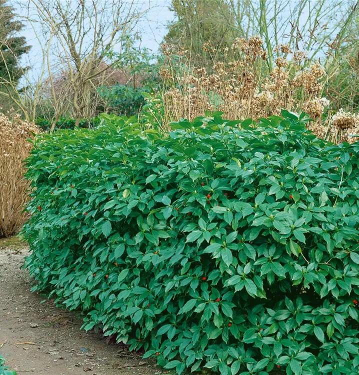 Besonders dekorativ sind die roten Beeren von Aucuba japonica. Diese erscheinen ab September.