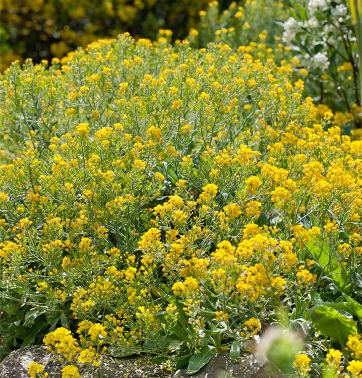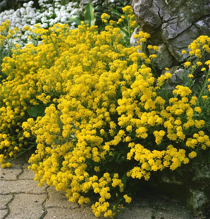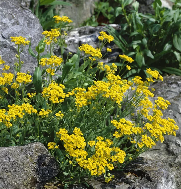 Das Felsen-Steinkraut (Aurinia saxatilis) ist eine kissenförmige wintergrüne Staude, die von April bis Mai gelbe, radförmige Blüten bildet. An einem sonnigen bis halbschattigen Standort mit durchlässigem, sandigem, lehmigem Boden erreicht es gewöhnlich eine Höhe von ca. 30 cm und wird ca. 40 cm breit. Das Felsen-Steinkraut ist gut frostverträglich.