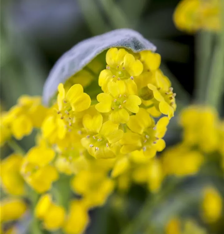 Aurinia saxatilis bildet radförmige, gelbe Blüten ab April.