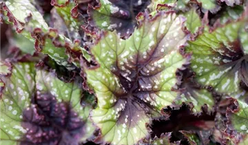 Hoher Blattschmuckwert. Die immergrünen Blätter der Königsbegonie sind bunt, herzförmig, gewellt.