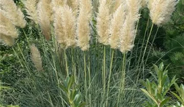 Das Pampasgras (Cortaderia selloana) ist mit seiner grau-grünen Blattfärbung ein dekoratives Gestaltungselement im Garten, welches sich an einem sonnigen Standort mit einem möglichst durchlässigen, humosen, nährstoffreichen Boden am wohlsten fühlt. Die weißen Blütenwedel schmücken die ausladend wachsende Pflanze ab Herbst. Bei günstigen Bedingungen erreicht dieses winterharte Gras eine Höhe von ca. 1,5 m und wird bis zu 1,5 m breit.
