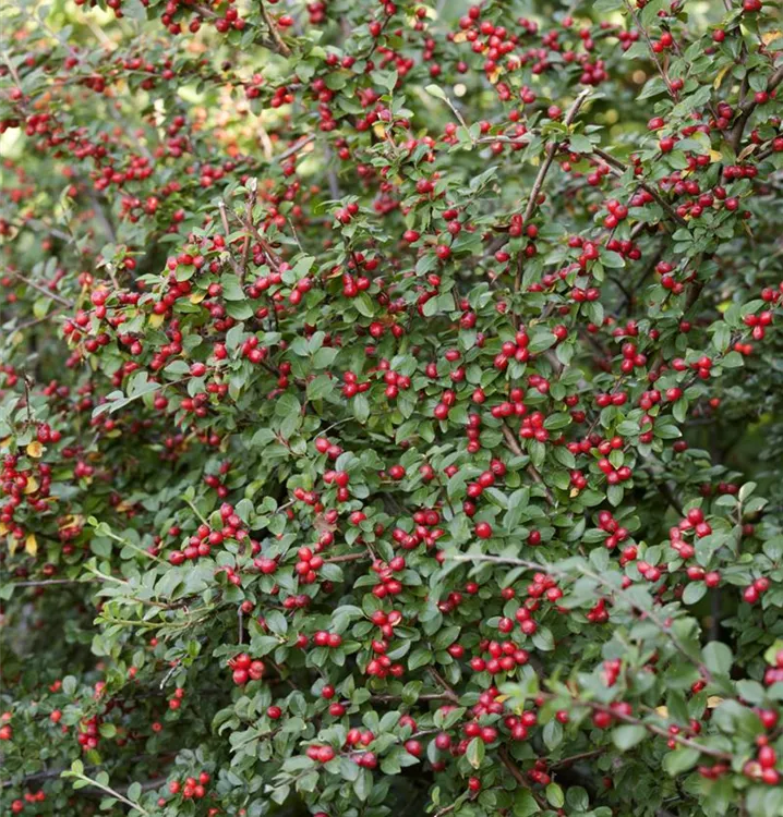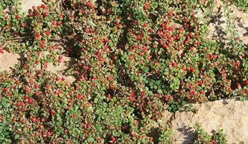 Besonders dekorativ sind die roten, runden Beeren von Cotoneaster dammeri. Diese erscheinen ab August.