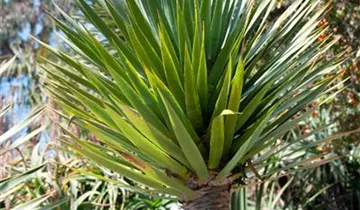 Der Drachenbaum (Dracaena draco) trägt blau-grüne Blätter. Diese aufrechte Pflanze gedeiht am besten an einem sonnigen bis halbschattigen Standort.