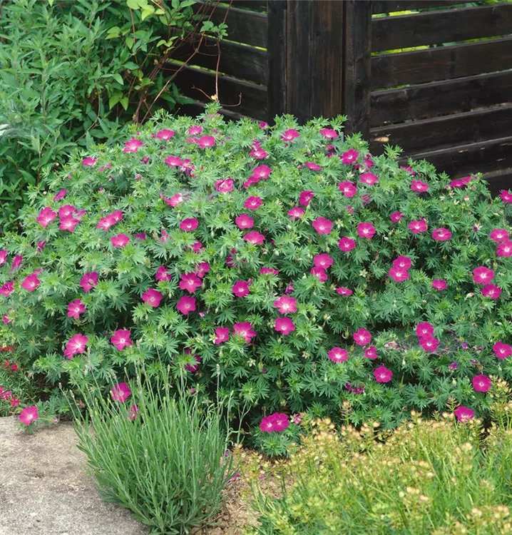 Geranium sanguineum bildet schalenförmige, karminrote Blüten ab Mai. Bei richtiger Pflege Nachblüte im September.
