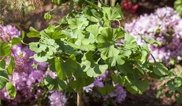 Der Fächerblattbaum 'Mariken', Stamm ist sommergrün. Seine Nadeln sindmittelgrün, nierenförmig. Fächerblattbaum 'Mariken', Stamm zeigt sich leuchtend gelb im Herbst.