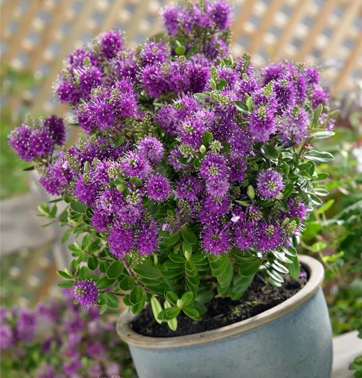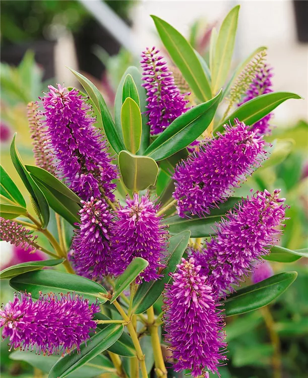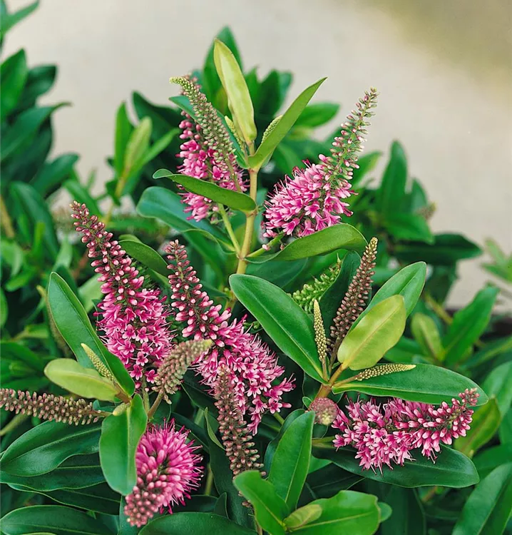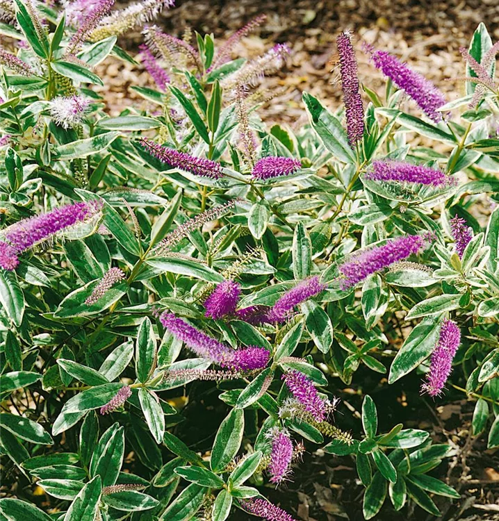Die Strauchveronika (Hebe x andersonii) eine buschige Gartenpflanze, die, je nach Sorte, lippenförmige Blüten in verschiedenen Farben hervorbringt. An einem sonnigen bis halbschattigen Standort mit durchlässigem, nährstoffreichem Boden erreicht sie gewöhnlich eine Höhe von ca. 60 cm und wird ca. 50 cm breit.