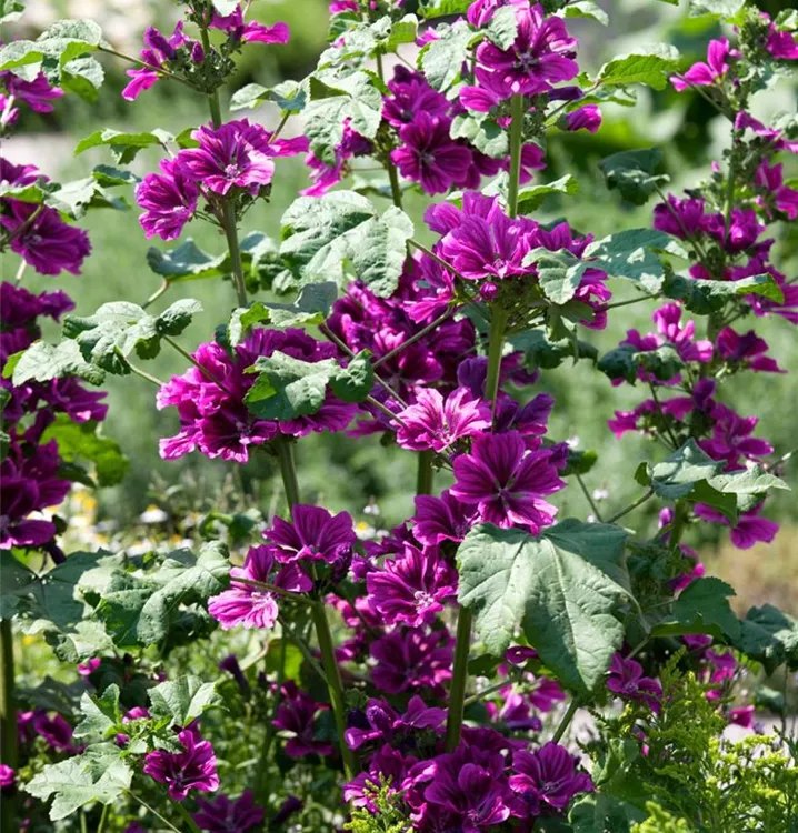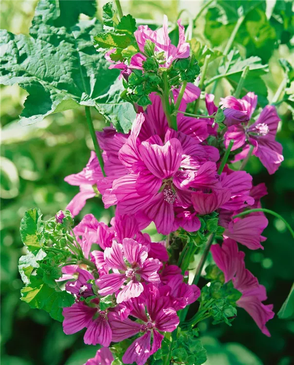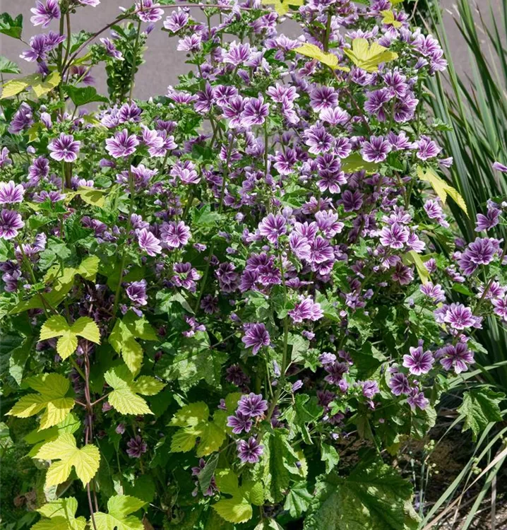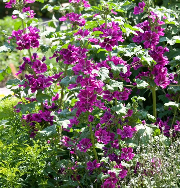 Die Garten-Malve (Malva sylvestris) ist eine aufrechte Staude, die von Mai bis September rosafarbene Blüten bildet. An einem sonnigen Standort mit humosem, nährstoffreichem Boden erreicht sie gewöhnlich eine Höhe von ca. 1 m und wird ca. 60 cm breit. Die Garten-Malve ist gut frostverträglich.