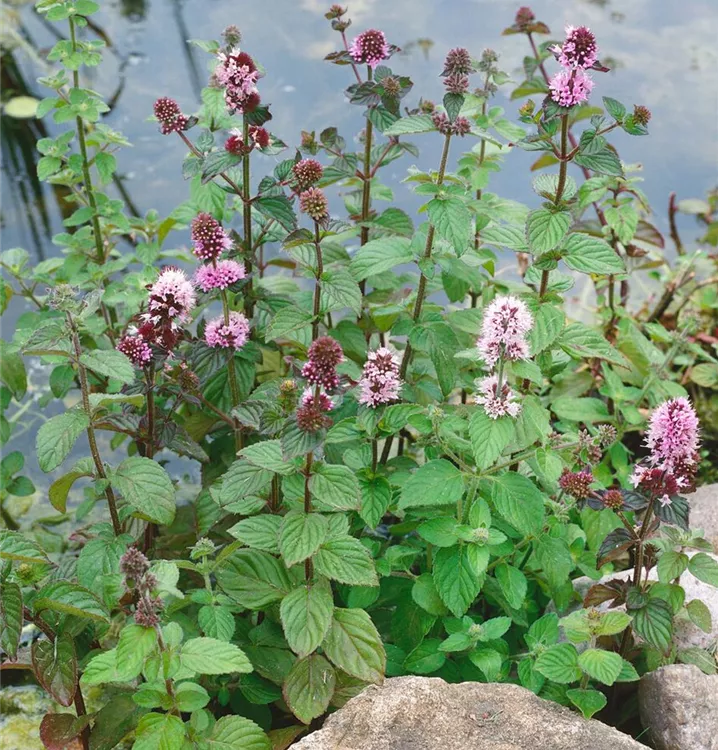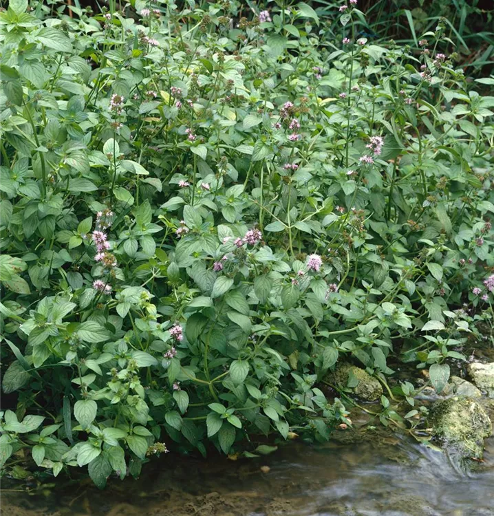 Die Bach-Minze (Mentha aquatica) ist mit ihren mittelgrünen, gezähnten Blättern eine ausgesprochen dekorative Wasserpflanze, die für solche Einsatzbereiche wie Medizin, Bauerngarten, Bienenweide, Teichrand, Bachlauf, Gemüsegarten, Verzehr und Tee besonders gut geeignet ist. Die Blüten erscheinen, je nach Sorte, in vielen Farben von Juli bis Oktober. Sie bevorzugt humosen, feuchten bis nassen Boden in sonniger bis halbschattiger Lage. Die Bach-Minze ist gut frostverträglich. Die aufrechte, ausläuferbildende Staude erreicht gewöhnlich eine Höhe von ca. 50 cm.