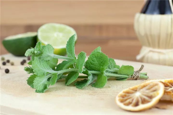 Zum Verzehr geeignet. Die mittelgrünen, gezähnten Blätter sind rundlich und überzeugen mit mildem, minzigem Geschmack.