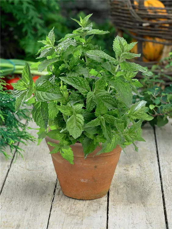 Zum Verzehr geeignet. Die mittelgrünen, gezähnten Blätter sind eiförmig und überzeugen mit erfrischendem Geschmack.