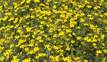Die gelben, schalenförmigen Blüten erscheinen von Juni bis Oktober.