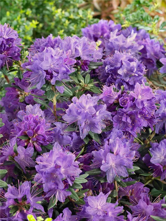 Rhododendron russatum 'Gletschernacht' bildet im Mai zahlreiche violette Blüten.