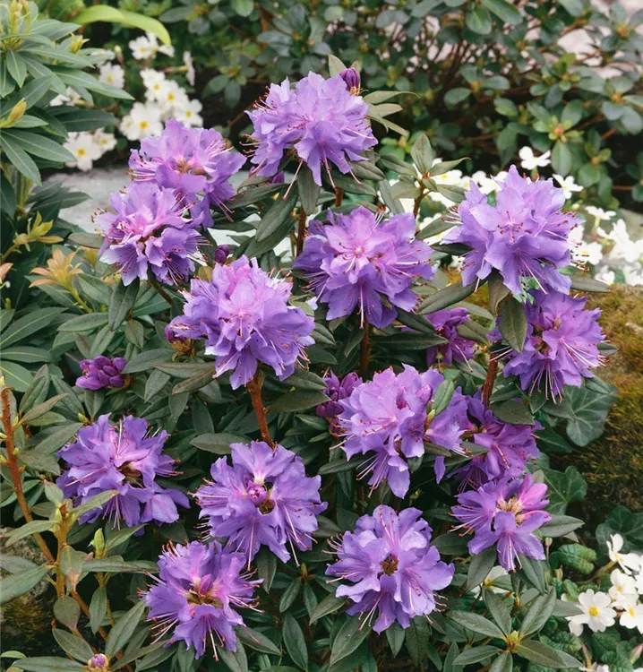 Der Rhododendron russatum 'Gletschernacht' setzt schöne Akzente gemeinsam mit: