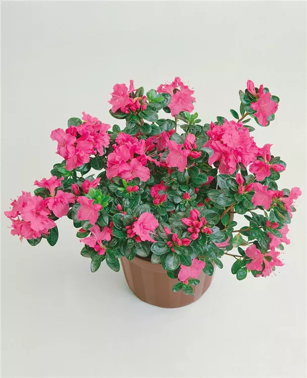 Die Zimmerazalee (Rhododendron simsii) ist eine dunkelrosa blühende Pflanze, die lanzettliche, dunkelgrüne, ganzrandige Blätter trägt. Ihre trichterförmigen Blüten erscheinen von August bis April. Diese aufrechte und kompakte Pflanze gedeiht am besten an einem sonnigen bis halbschattigen Standort.