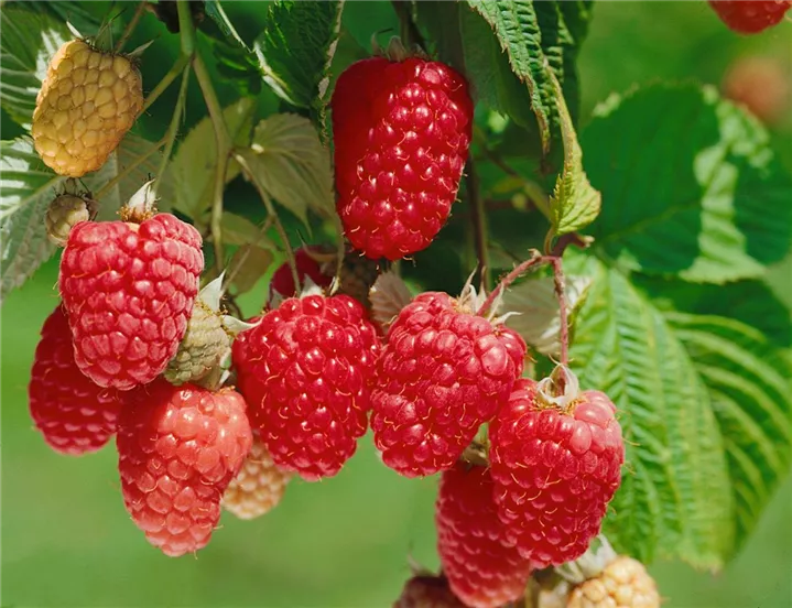 Die Himbeere 'Himbo-Top'<sup>®</sup> (Rubus idaeus) bildet leuchtend rote, große Beeren. Diese sind fest und aromatisch, süß im Geschmack. Für eine ertragreiche Ernte ab August schaffen durchlässiger, nährstoffreicher Boden und ein sonniger bis halbschattiger Standort optimale Bedingungen. Auch ihre weißen Blüten sind eine schöne Erscheinung.