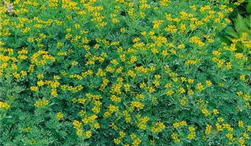 Die Weinraute (Ruta graveolens) ist eine aufrechte wintergrüne Staude, die von Juni bis August gelb-grüne Blüten mit einem angenehmen Duft bildet. An einem sonnigen Standort mit durchlässigem Boden erreicht sie gewöhnlich eine Höhe von ca. 60 cm und wird ca. 40 cm breit. Die Weinraute ist gut frostverträglich.