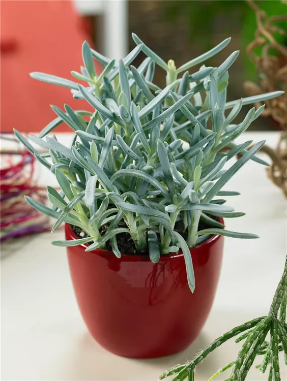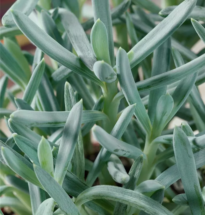 Das Greiskraut (Senecio barbertonicus) trägt grau-grüne Blätter. Diese strauchartige, sukkulente und kompakte Pflanze gedeiht am besten an einem hellen Standort.
