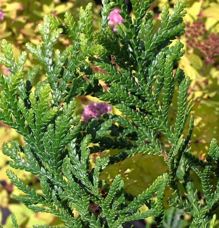 Der Hiba-Lebensbaum (Thujopsis dolabrata) ist ein Kleinbaum, welcher kegelförmig wächst und gewöhnlich eine Höhe von ca. 10 m und eine Breite von ca. 5 m erreicht. Seine schuppenförmigen, ledrigen Blätter haben eine dunkelgrüne Färbung. Dekorative braune Zapfen zieren Thujopsis dolabrata ab September. Dieses Gehölz ist gut frostverträglich. Er bevorzugt durchlässigen, humosen, sandigen Boden in sonniger bis halbschattiger Lage.