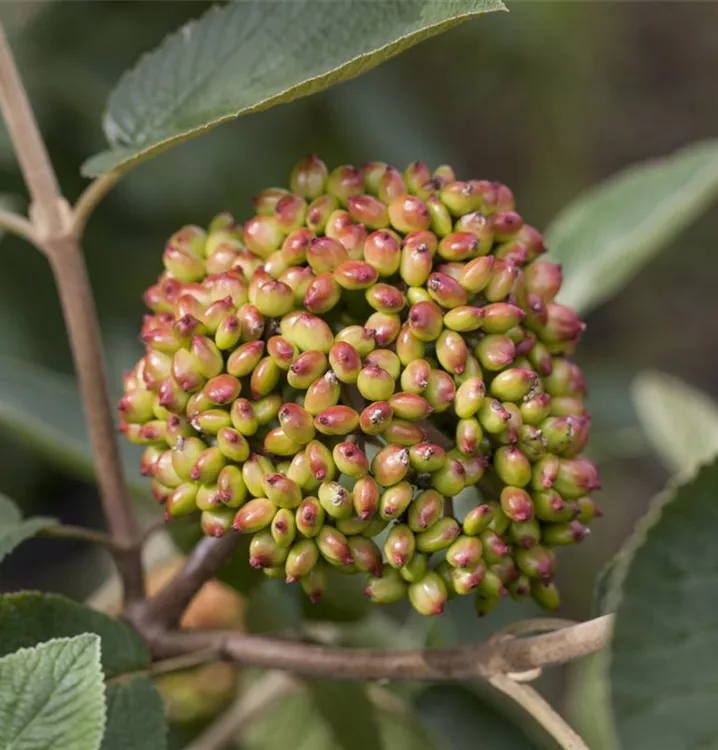 Besonders dekorativ sind die roten, ovalen Steinfrüchte von Viburnum rhytidophyllum. Diese erscheinen ab August.