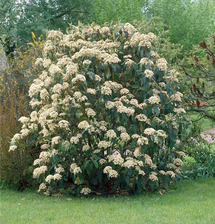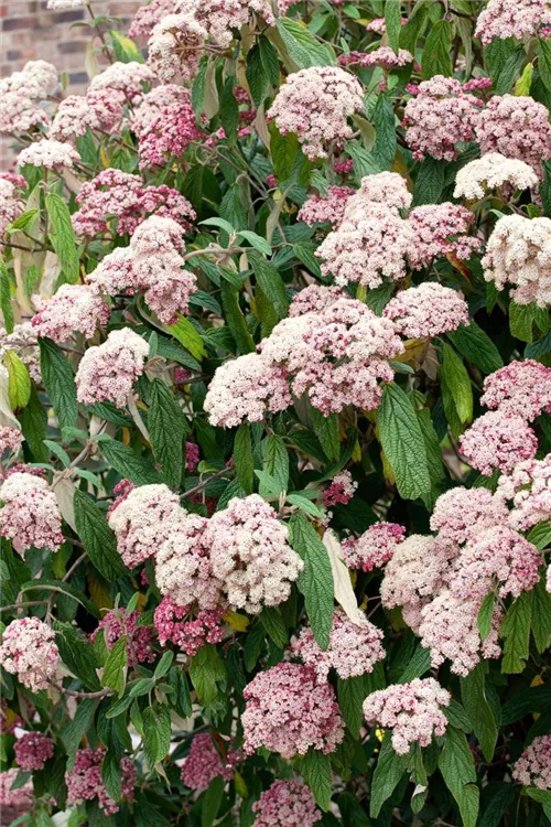 Der Zungen-Schneeball (Viburnum rhytidophyllum) ist ein überhängender Großstrauch mit dekorativen, roten, ovalen Früchten. Die Blüten erscheinen je nach Sorte in verschiedenen Farben.