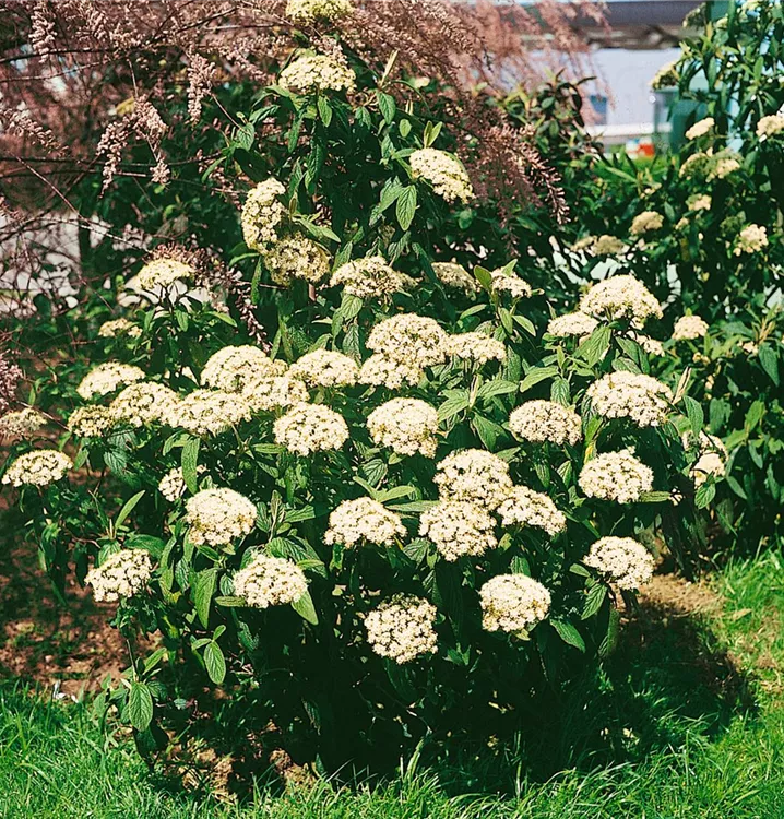 Die cremeweißen Blüten des Zungen-Schneeball erscheinen in Schirmtrauben von Mai bis Juni. Diese sind angenehm duftend.