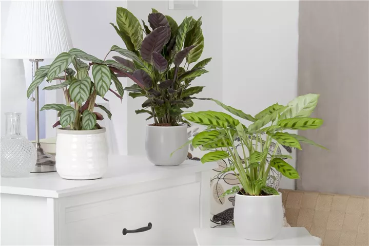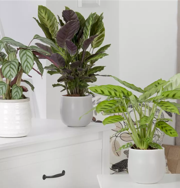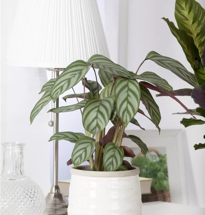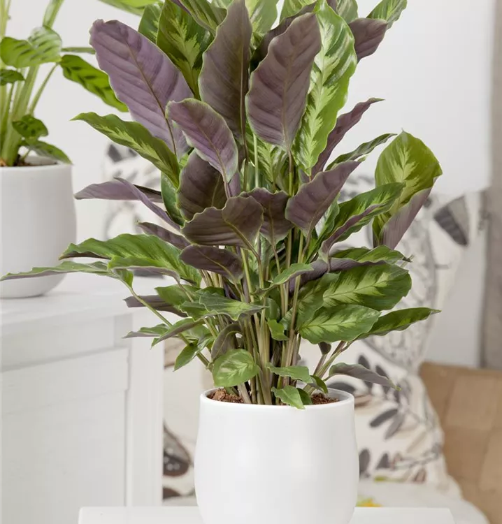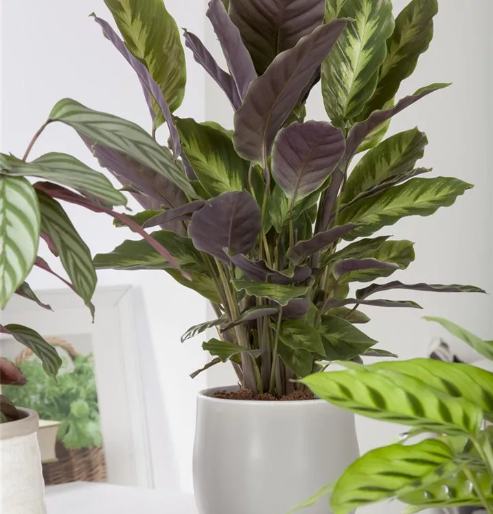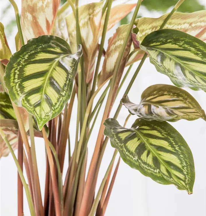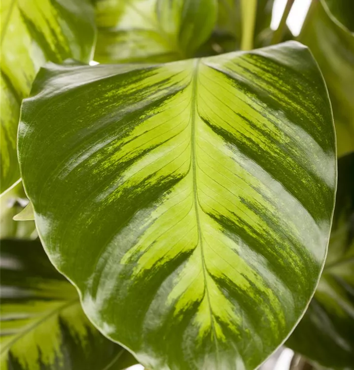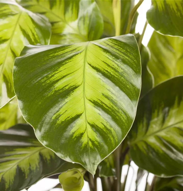 Die Korbmarante (Calathea) ist eine Pflanze mit dekorativen, mehrfarbigen Blättern. Sie sind eiförmig und gewellt. Bevorzugt wird ein halbschattiger Standort.