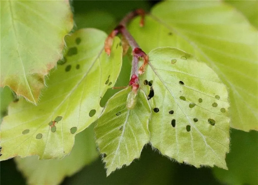 Der kleine schwarze Buchenspringrüssler (Rhynchaenus fagi) überwintert als Käfer. Im Frühjahr fressen die Tiere Löcher ins Laub. Später legen sie ihre Eier an die Buchenblätter ab. Die daraus schlüpfenden Larven fressen das Blattgewebe zwischen oberer und unterer Blatthaut. Dieses minierte Blattgewebe färbt sich braun.