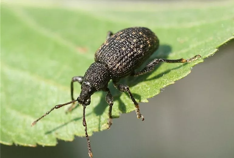Der Dickmaulrüssler gehört zur Gruppe der Rüsselkäfer. Die grauen, ca. 1 cm langen Käfer fressen bei Dunkelheit an den Blättern verschiedener Gehölze und Stauden.