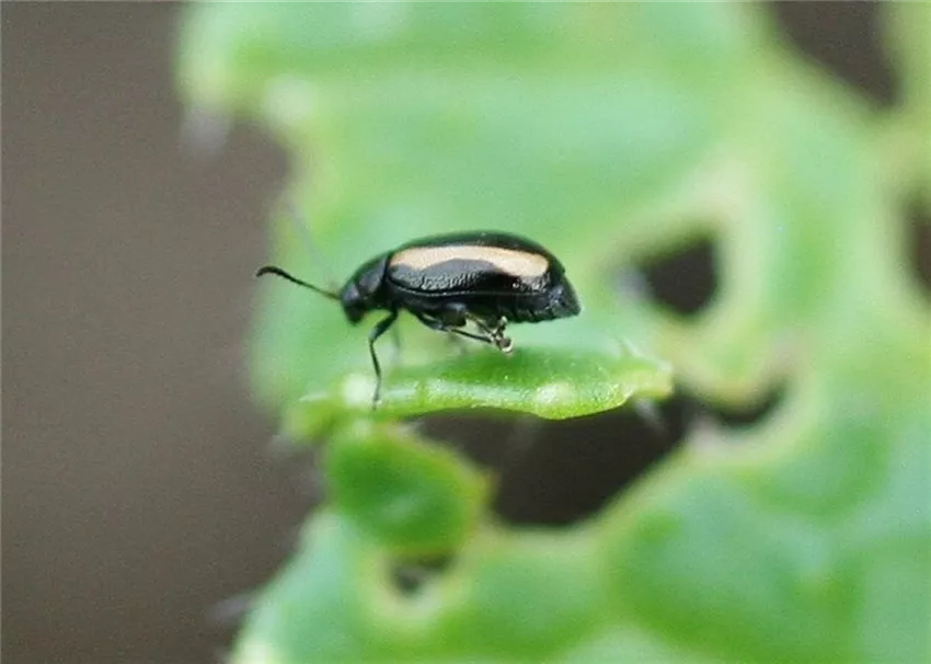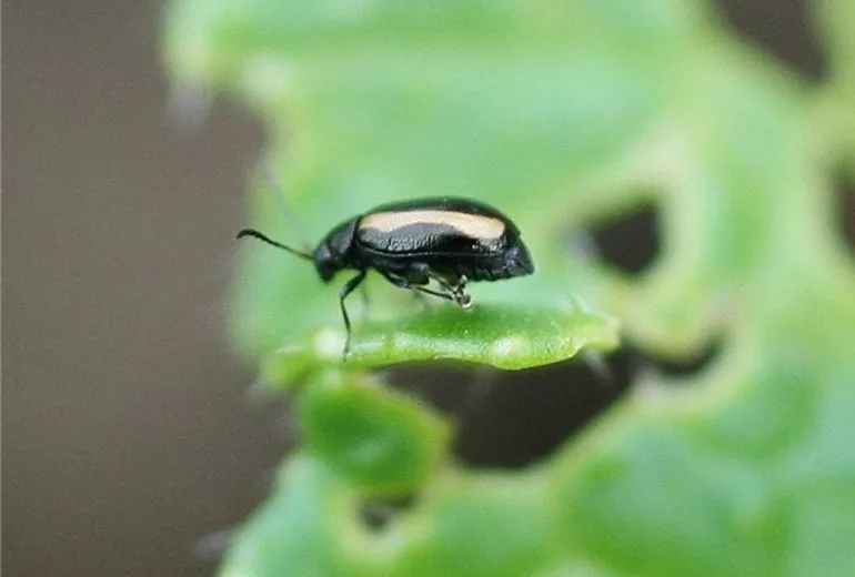 Bei genauerem Hinschauen erkennt man auf Blättern und Boden sehr kleine schwarze oder gelb gestreifte Käfer, die auffällig gut springen können.