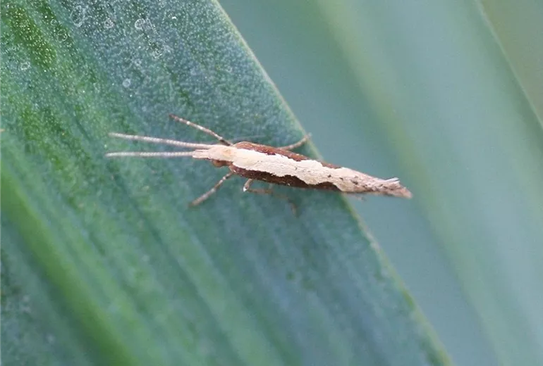 Die Lauchmotte (Acrolepiopsis assectella) ist ein Kleinschmetterling, der in zwei Generationen pro Jahr auftritt. Ab Juni ist mit dem Flug der Falter zu rechnen. Die Eier werden an die Blätter gelegt. Aus ihnen schlüpfen die kleinen Räupchen, die durch ihren Fraß die beschriebenen Symptome verursachen.