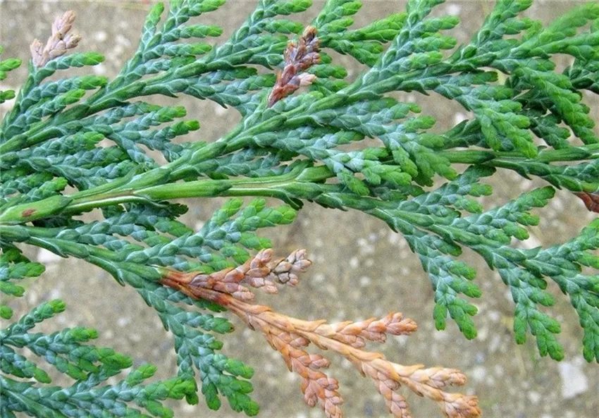 Die Triebspitzen von Scheinzypressen (Chamaecyparis) sind braun verfärbt. Bei genauerer Untersuchung kann man feststellen, dass die geschädigten Zweigspitzen innen hohl gefressen und mit schwarzen Kotkrümelchen gefüllt sind.