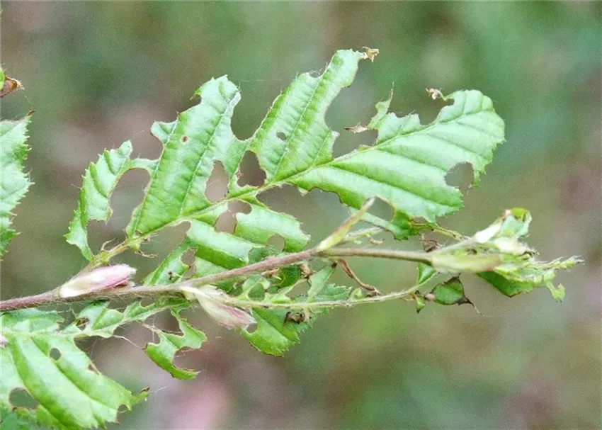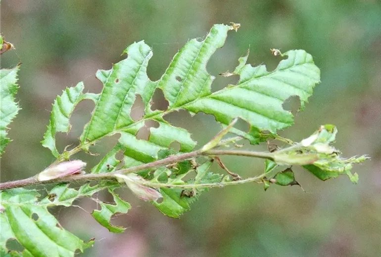 An den Blättern zeigen sich Fraßstellen. Je nach Schädling kann man deutlich Raupen erkennen. Manchmal ist auch nur der krümelige Kot der Schädlinge zu finden.