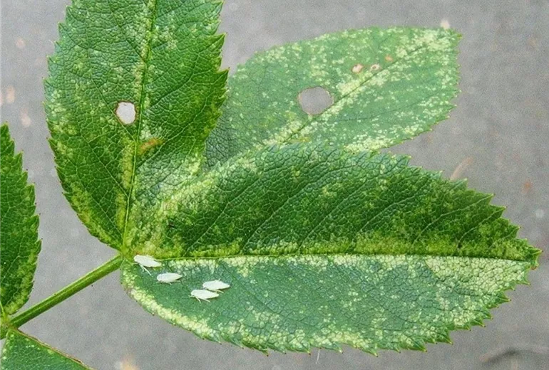 Die Rosenblätter zeigen anfänglich eine feine, weißgelbe Sprenkelung der Blätter. Sie beginnt meist entlang der Blattadern und breitet sich später auf das ganze Blatt aus.