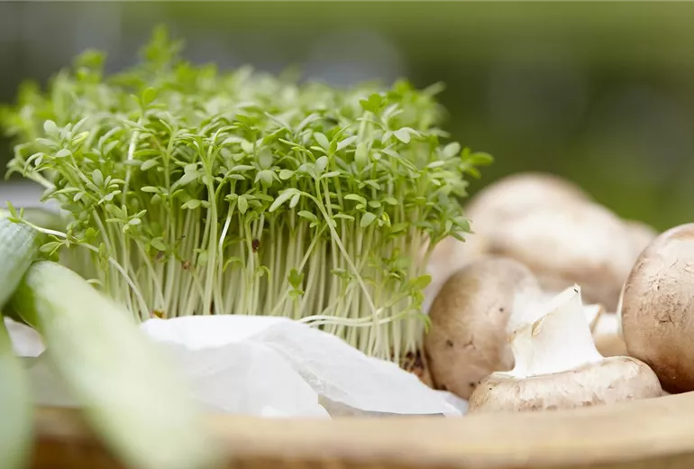Wenn die Tage im Winter kurz und dunkel sind, gibt es nichts Schöneres als frisches Grün. Draußen ist es für die meisten Gemüsearten schon zu kalt, aber auch auf der Fensterbank können Sie für frische Vitamine sorgen: Kaufen Sie sich Kresse-Samen und füllen Sie eine Schale flach mit Erde. Drauf werden die Kresse-Samen ausgesät. Diese keimen innerhalb weniger Tage. Die Samen können alternativ auch auf angefeuchteter Watte oder Küchenkrepp ausgesät werden. Geerntet wird sobald die ersten richtigen Blätter ausgebildet sind. Sie können damit zum Beispiel ihren Salat oder Frühstücksbrötchen verfeinern.