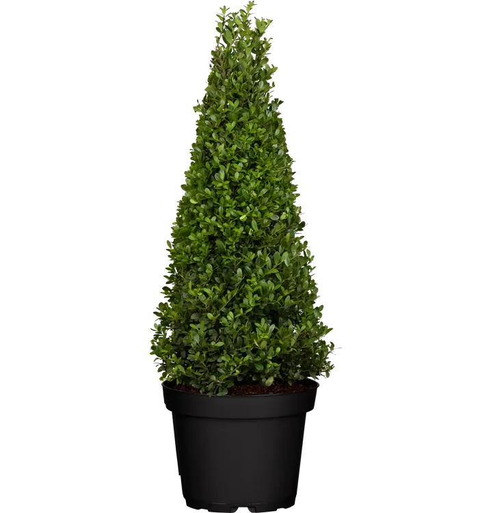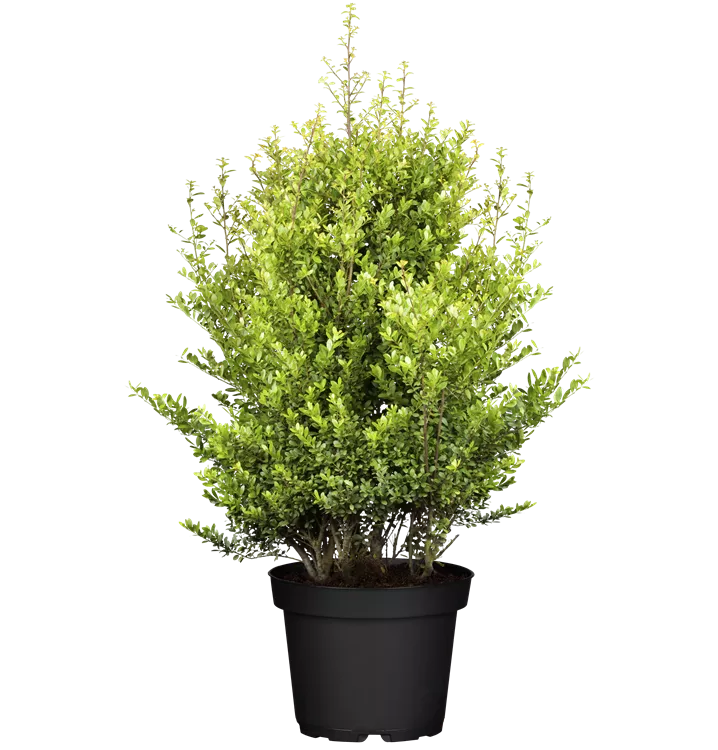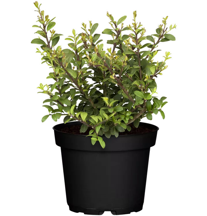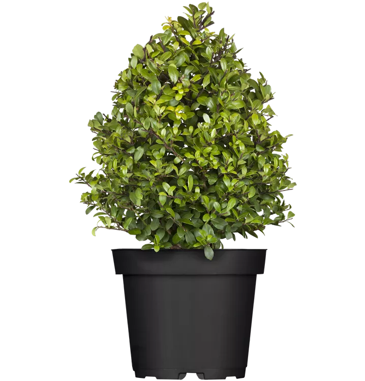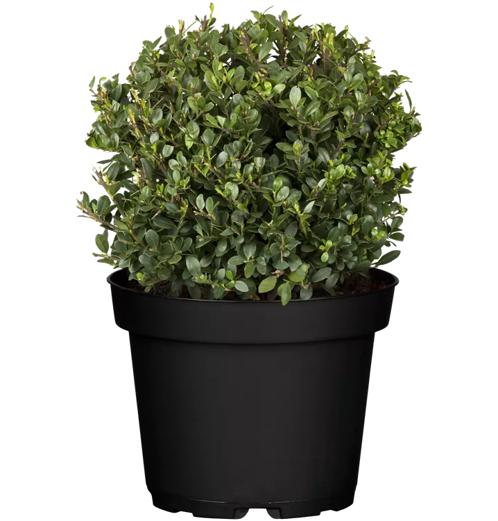 Aus diesen gehen schwarze Früchte hervor, die sehr lange haften. Zudem trägt der Löffel-Ilex 'Dark Green'<sup>®</sup>, rundliche, dunkelgrüne Blätter. An einem sonnigen bis halbschattigen Standort mit durchlässigem, lockerem, schwachsaurem Boden erreicht er gewöhnlich eine Höhe von ca. 3,5 m und wird ca. 2 m breit.