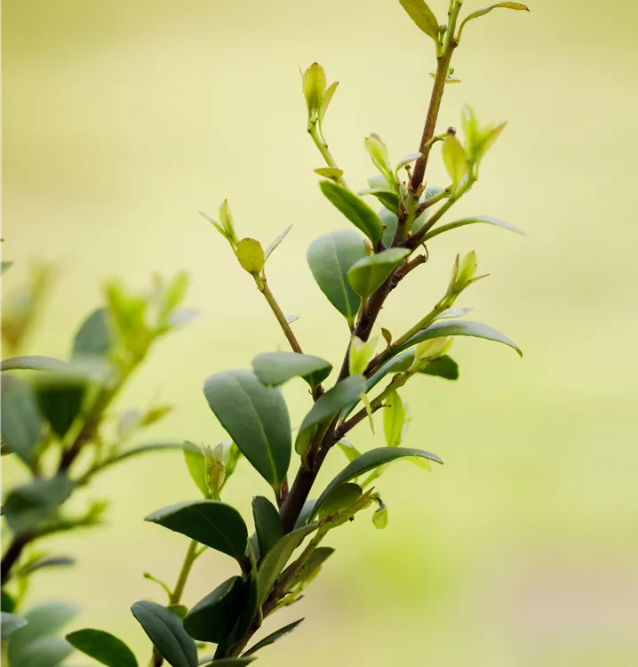 Die immergrünen Blätter des Löffel-Ilexes 'Dark Green'® sind dunkelgrün, rundlich, wechselständig. Diese sind etwa 2 - 3 cm groß.
