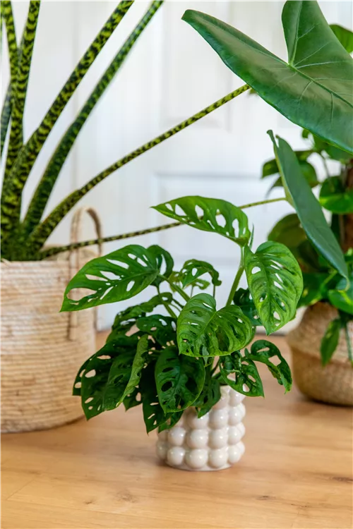 Das Geschlitzte Fensterblatt (Monstera adansonii) ist eine Pflanze mit dekorativen, löchrigen, dunkelgrünen Blättern. Sie sind herzförmig. Diese rankende Pflanze gedeiht am besten an einem sonnigen bis halbschattigen Standort.