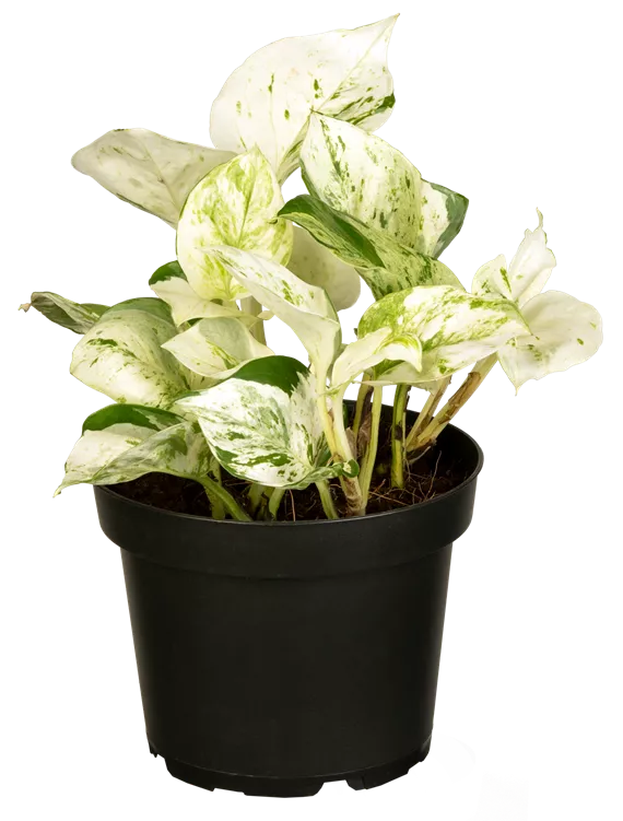 Die Blätter der Efeutute 'Happy Leaf' sind weiß-grün, herzförmig.