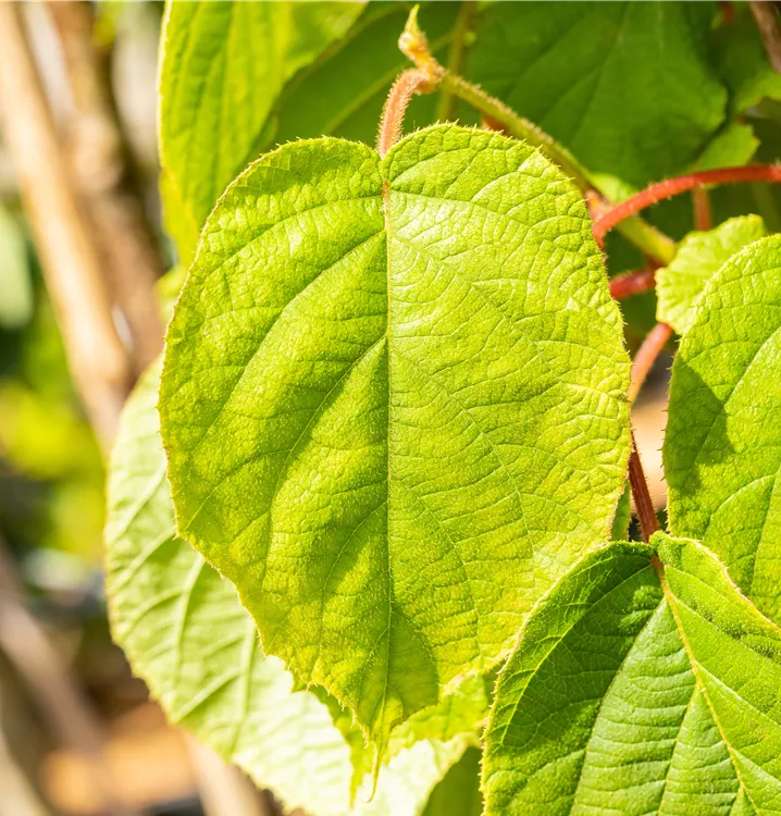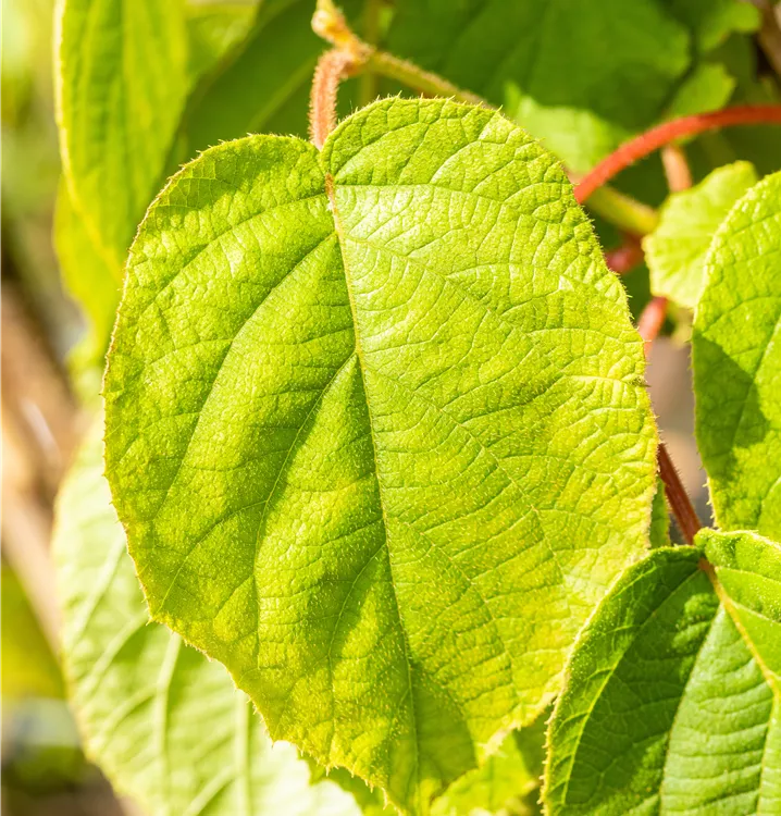 Die sommergrünen Blätter der Kiwi 'Solo' sind dunkelgrün, rundlich, wechselständig. Diese sind etwa 10 - 15 cm groß.