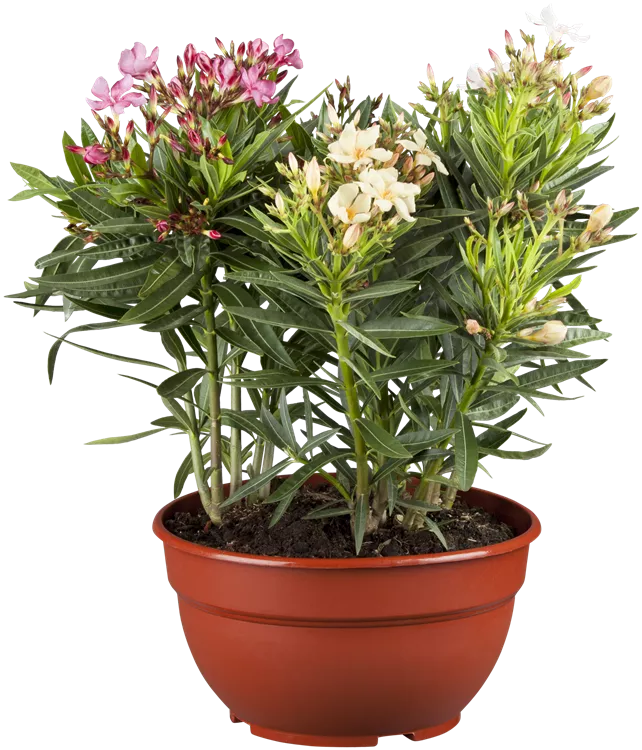 Nerium oleander 'Tricolor' bildet bunte Blüten ab Juni.