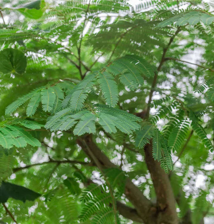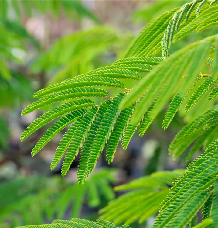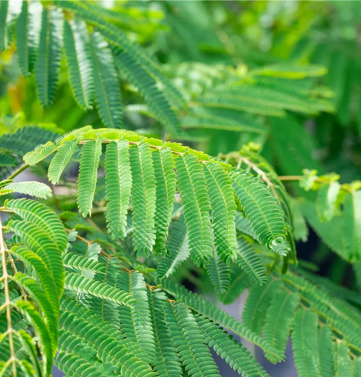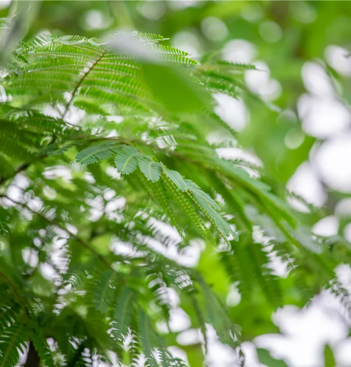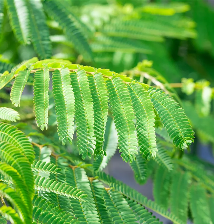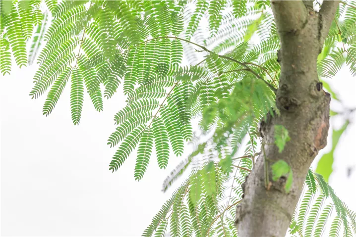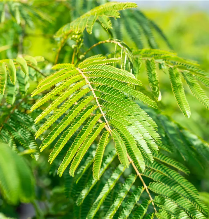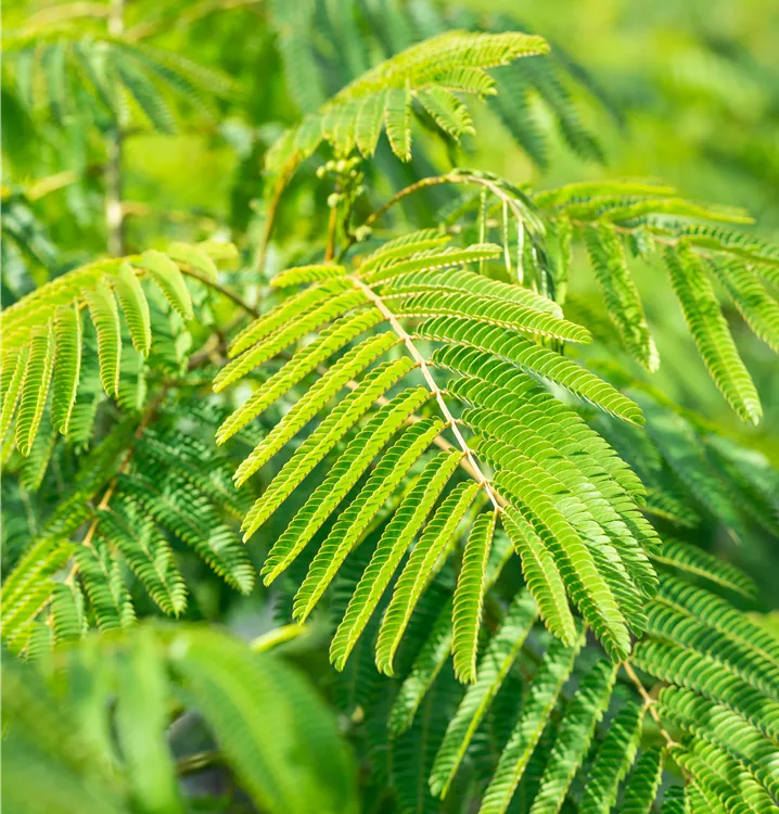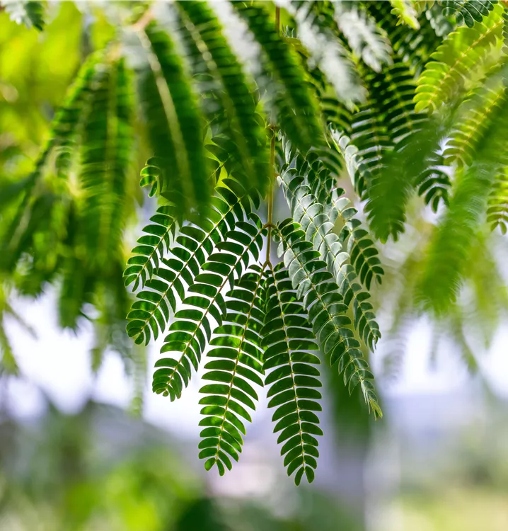 Die sommergrünen Blätter des Seidenbaums 'Ombrella' sind dunkelgrün, gefiedert. Seidenbaum 'Ombrella' zeigt sich leuchtend gelb-grün im Herbst.