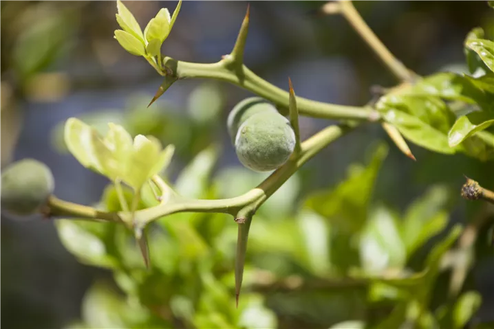 Die Triebe von Poncirus trifoliata sind bedornt, grün.
