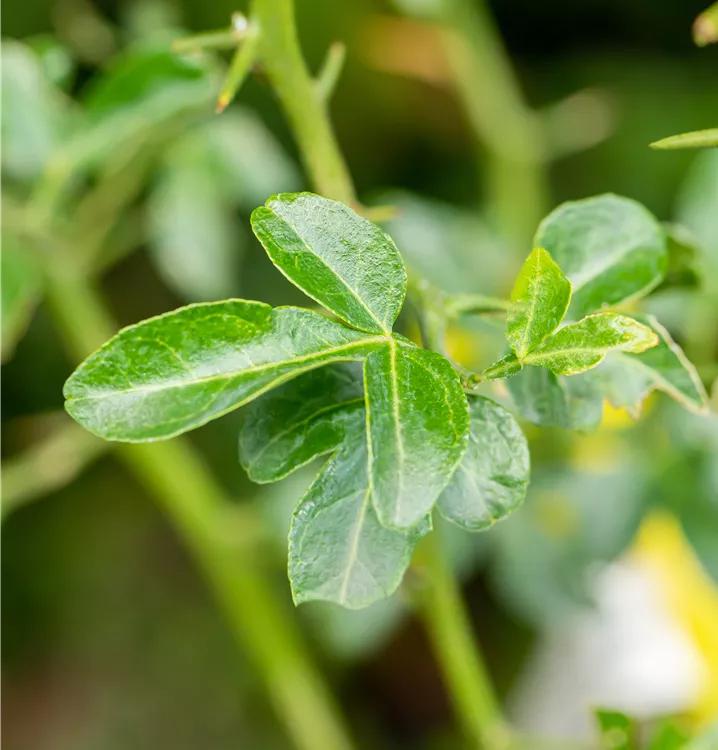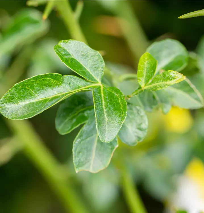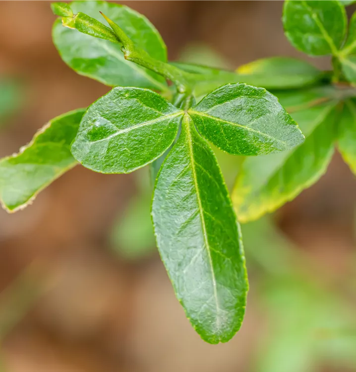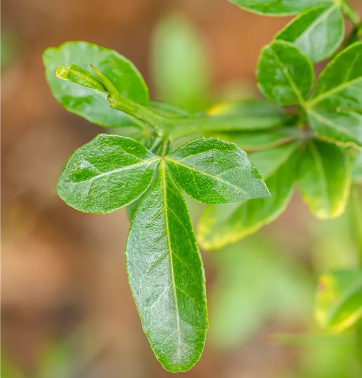 Die sommergrünen Blätter der Bitterorange sind dunkelgrün, eiförmig, gesägt. Bitterorange zeigt sich leuchtend gelb-orange im Herbst.
