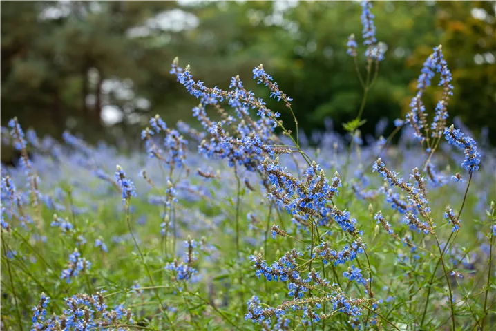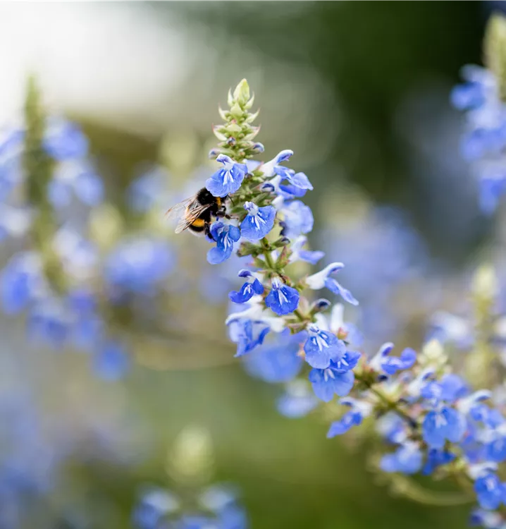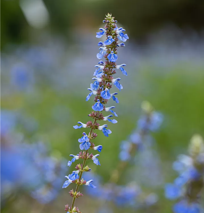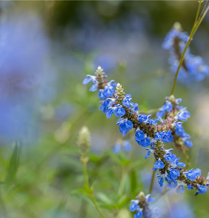 Salvia uliginosa bildet lippenförmige, in Rispen angeordnete, hellblaue Blüten ab August.