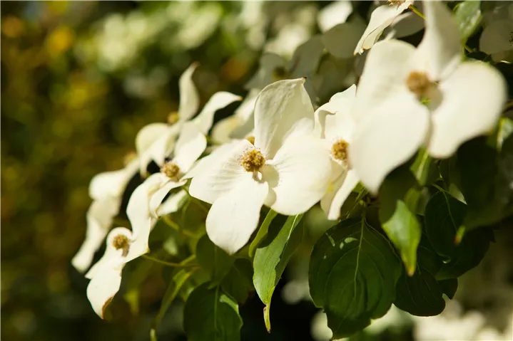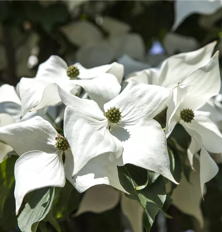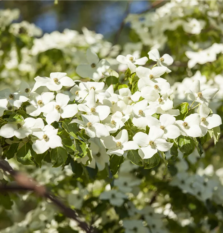 Die weißen Blüten des Chinesischen Blumen-Hartriegel erscheinen in Dolden von Ende Mai bis Juni. Diese werden etwa 8 - 10 cm groß.