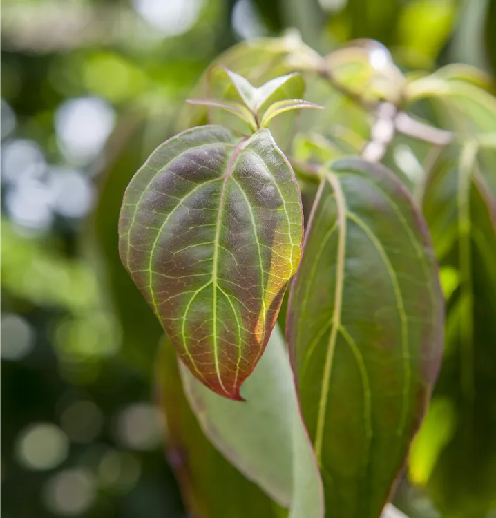 Die sommergrünen Blätter des Chinesischen Blumen-Hartriegels sind mittelgrün, eiförmig, gegenständig, ganzrandig. Diese sind etwa 8 - 12 cm groß. Chinesischer Blumen-Hartriegel zeigt sich leuchtend scharlachrot im Herbst.
